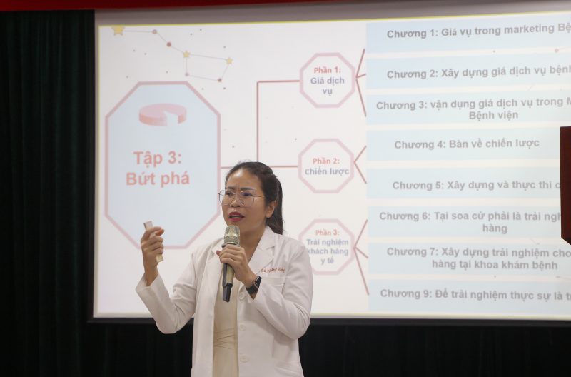 Tiếp theo, các đại biểu được BS.CKII Võ Thị Hồng Hướng – Trưởng phòng Kế hoạch tổng hợp Bệnh viện 199 đã “Review bộ sách Marketing Bệnh viện thực hành”. Ở cuốn thứ 1 – Khởi động, các nội dung được trình bày thành các ý chính có giải thích ngắn gọn giúp bạn nắm bắt được tổng thể và có thể phác thảo kế hoạch thực hiện nhanh chóng. Cuốn sách được chia làm 3 phần: Phần 1, Dành cho ban giám đốc và trưởng khoa phòng. Phần 2, Marketing tại khoa điều trị; Phần 3, Những nội dung tác giả sẽ viết ở những cuốn sách tiếp theo.