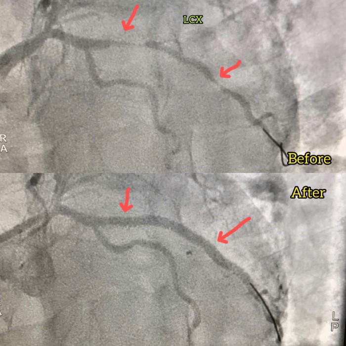 Hẹp nặng động mạch mũ 99% (hình ảnh trước và sau can thiệp)