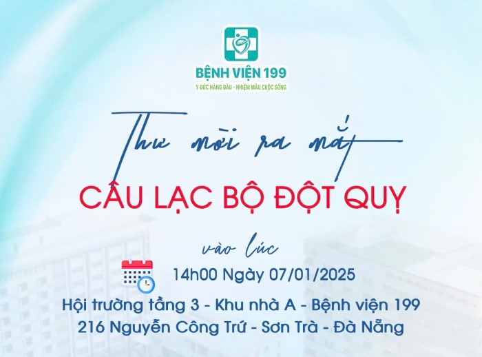 Với mục tiêu nâng cao nhận thức cộng đồng, hỗ trợ phục hồi nâng cao chất lượng sống, tăng cường phòng ngừa tái phát giảm biến chứng cho bệnh nhân. Đồng thời xây dựng mô hình chăm sóc đa ngành và kết nối các nguồn lực xã hội. Qua đó, góp phần xây dựng môi trường hỗ trợ tích cực, toàn diện cho bệnh nhân trong hành trình phục hồi, cải thiện chất lượng chăm sóc sức khỏe trong cộng đồng. Bệnh viện 199 tổ chức ra mắt “Câu lạc bộ Đột quỵ” vào ngày 07.01.2025, Ban Tổ chức trân trọng kính mời các cơ quan thông tấn, báo chí quan tâm tham dự đưa tin.